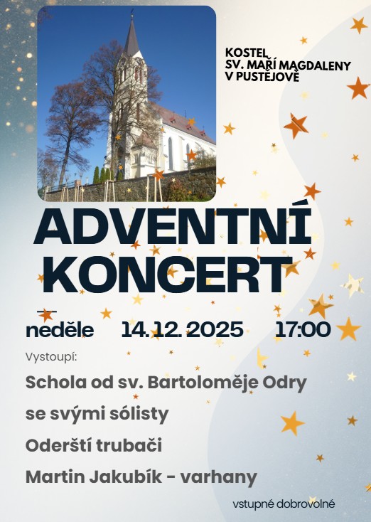 přijďte se sklidnit a nasát předvánoční atmosféru třetí adventní neděli do kostela sv. Maří Magdaleny v Pustějově.